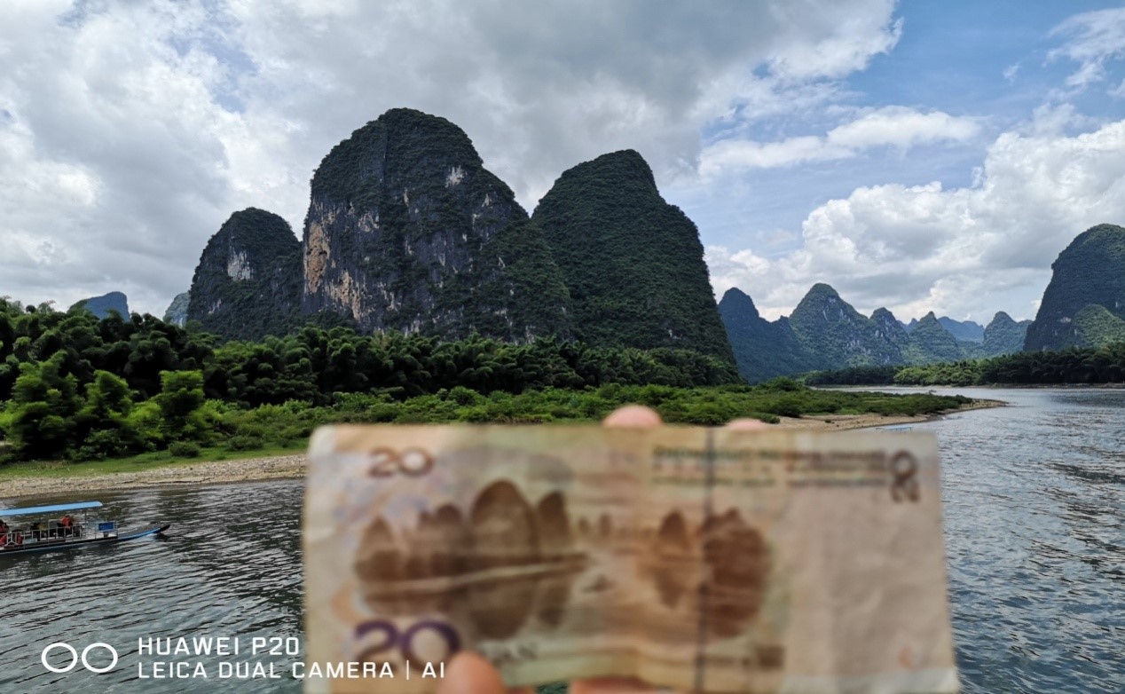 微風(fēng)拂面,水流緩慢,前方一處熟悉的景色跳入眼簾,那就是20元人民幣背面的圖案—黃布倒影。見(jiàn)到實(shí)景圖,大家異常興奮,有的還拿出20元,拍個(gè)比對圖,果然是一模一樣??!聽(tīng)導游介紹,從這里的水面上可以看到江底有塊米黃色的大石板,長(cháng)、寬各數丈,恰似一匹黃布平鋪在河床之上,黃布灘由此得名。