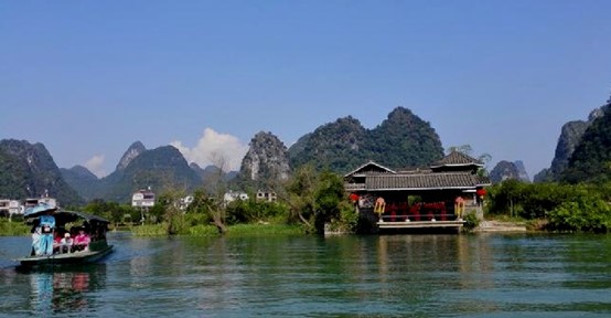 我們先去了世外桃源,乘輕舟環(huán)繞湖光山色、田園村舍,感受到了陶淵明筆下的“芳草鮮美、落英繽紛”的山水田園風(fēng)光。這里藏著(zhù)桂林最樸素的民族風(fēng)情。兩岸的少數名族狂歌勁舞,歡迎“狗肉”們的到來(lái),(桂林稱(chēng)呼朋友為狗肉)。此情此景,讓你忘記了所有的煩惱,沉靜在這“仙境”中。