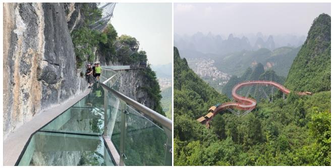 玩過(guò)了水,一定要登山去看風(fēng)景,我們選擇了陽(yáng)朔的最高峰-如意峰。坐索道上山再走一段臺階就到了,如意峰頂是360°觀(guān)景臺,是祈福心愿的吉祥圣地,也是遠眺峰林奇觀(guān)的最佳地?!皶?huì )當凌絕頂,一覽眾山小”,放眼望去,綠意蔥蘢、峰林疊嶂、田園如畫(huà)。來(lái)如意峰,還有個(gè)比較吸引人的景觀(guān)是懸空而建的玻璃棧道,行走其上驚險刺激,極具挑戰性。你可以體驗從兩腿打顫、頭暈、到幾秒內戰勝自己,從而全程通過(guò)的快感。