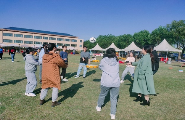 第二組游戲<同心鼓>,按每組安排12人,每人牽拉一根鼓上的繩子,即可開(kāi)始顛球。一旦顛球開(kāi)始后,鼓不得落地;球飛離鼓面后,不得將鼓摔落在地上,放下時(shí)要緩慢;在規定時(shí)間內,顛球次數最多為勝方。聽(tīng)說(shuō)最高記錄有60幾個(gè),我們當時(shí)都覺(jué)得那太不可思議了。在隊員們不斷的嘗試和磨合中,我們總結出一套適合我們團隊的策略,游戲結果雖未打破記錄,但我們突破了自我,完成了自認不可能完成的任務(wù),收獲到了成功的喜悅。所有成員同心協(xié)力,相互信任和配合,并不斷地在實(shí)踐中摸索方法和技巧,最終取得圓滿(mǎn)。這種團隊精神是一股無(wú)形的動(dòng)力,它激勵著(zhù)每一位默默地為團體奉獻著(zhù)自己,推動(dòng)著(zhù)每一項任務(wù)的完成。